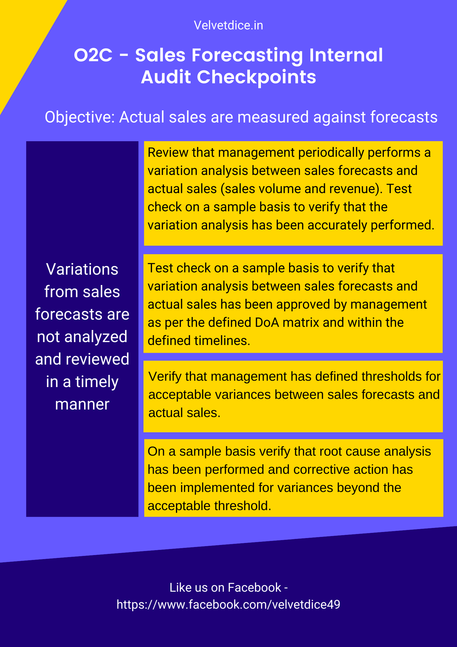 Just like any business plan or strategy that the company sets, sales forecasting is an important aspect of achieving that set plan or strategy. Most of the time an internal audit is not done on the sales forecasting, because there’s a misconception that sales forecast is based on predictions done by the sales managers. In reality, sales forecast is driven mostly by data from the past either from their own organization or their competitors or based on the pulse of the market. There’s definitely decision-making aspect involved in this and of course a very ambitious management sometimes forecast sale a lot higher than the sales managers can achieve. Let’s jump into the check points for sales forecasting while auditing O2C process. If you’ve doubts or wish to understand the general O2C process click here.